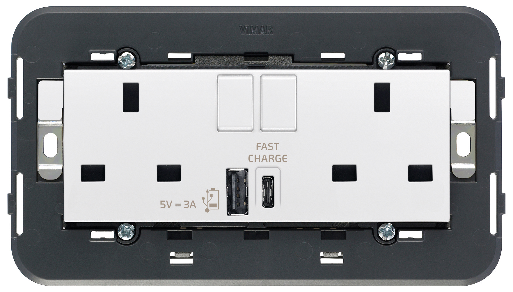 Two 2P+T 13 A 250 V~ SICURY socket outlets, British standard with two 2P 1-way switches, one USB type A output and one USB type C output, complete with mounting frame for installation in rectangular BS mounting boxes, to be completed with BS 5-module cover plate, white
