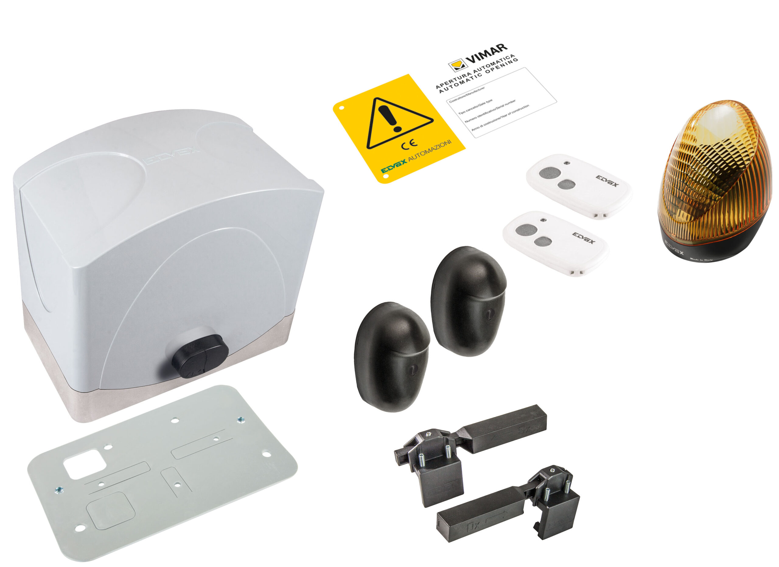 Kit ACTO 600D for sliding gates up to 600 kg. Contents: 1 ESM2 ACTO 600Dnon-reversible 24 V electromechanical operator, 1 ELA5 12/24 V LED flashing light with built-in aerial, 2 ETRN2 2-channel 433 MHz rolling code remote controls, 1 EFA3 pair of photocells, 1 ZX20 warning sign, 1 ZX16 fixing plate