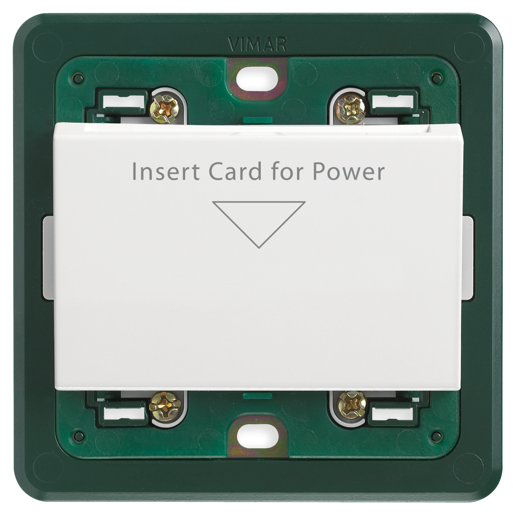Electronic badge switch with vertical pocket, 16 A 230 V~ change-over relay output, supply voltage 230 V~ 50-60 Hz, with built-in mounting frame for British standard square mounting boxes, to complete with 3-module British standard cover plate, white. Provided without ISO card (badge)