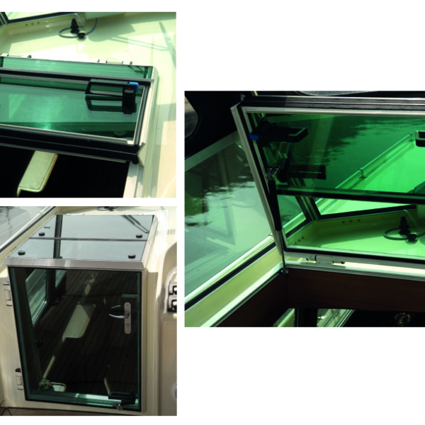 The windscreen can be manufactured with three or more panels. The top rail is finished with a rubber section; cables for lighting and windscreen wipers etc. can be hidden within the top rail and the top rail can be fitted with Tenax fasteners for attaching a hood. The bottom rail can also be made with a longer fixing flange. The length of this flange is 37 mm instead of 16 mm.