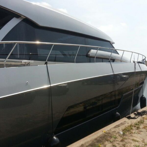 The bottom rail of each section is fitted with two ‘lift-off’ type hinges which allows the screen to be hinged outward and then removed. This makes passing under low bridges possible. The top rail is finished with a rubber section. The top rail can be fitted with Tenax fasteners for attaching a hood.