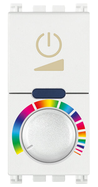 Infrared receiver with dimmer, supply voltage 230 V~ 50 Hz for: 40-450 W incandescent lamps, 40-450 VA ferromagnetic transfomers and 40-300 VA inductive response electronic transformers, control and regulation with built-in push button, 01849 remote control or from NO peripheral push buttons, MASTER function, MOSFET+TRIAC technology, visible in darkness, white